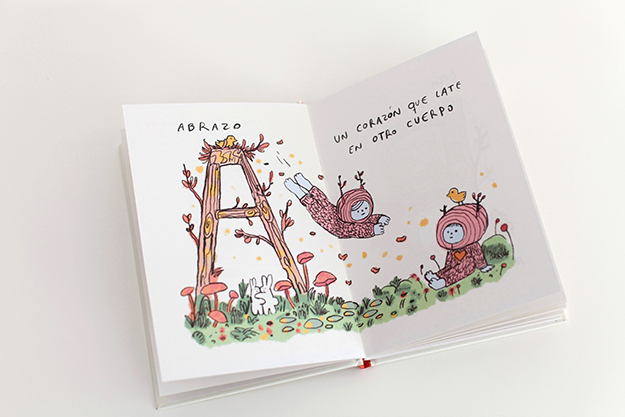 Los abecedarios son un recurso eterno y perfecto para jugar con el lenguaje, los sonidos y, al mismo tiempo, aprender a relacionar ideas y conceptos. Es ese orden alfabético el que va a ofrecer un hilo del que aferrarse para hacer este recorrido mágico. Entonces, ese alfabeto es el que trazará un caminito sinuoso en el que vamos a poder leer que un Abrazo es un corazón que late en otro cuerpo; que Despertar es ver el mundo con ojos nuevos; que una Isla es un pedacito de tiempo para compartir o que la Voz es un instrumento que se usa para susurrar los secretos del mundo.  En cada letra, el lenguaje toma nuevas formas de expresar el vínculo de ternura, integrando no solo las palabras, sino también el lenguaje corporal, ese silencio que a veces habla más que cualquier discurso.